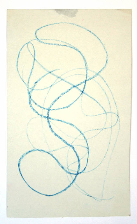 disegno con pastello a olio azzurro su cartoncino bianco nel recto, marrone nel verso. Colore: azzurro e bianco. Soggetto: studio per decorazione parietale.
