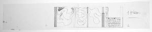 disegno a penna biro nera e matita su fotocopia. Colore: bianco, nero e grigio. Soggetto: progetto di decorazione parietale, i piano, sezione l.