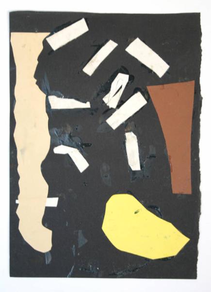 disegno con collage: tela bianca e cartoncino. Colore: beige, giallo, marrone, nero e bianco. Soggetto: studio per decorazione parietale.