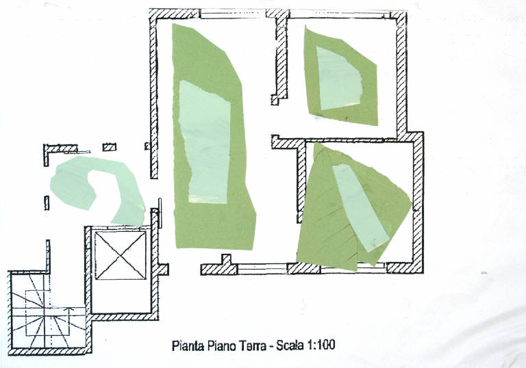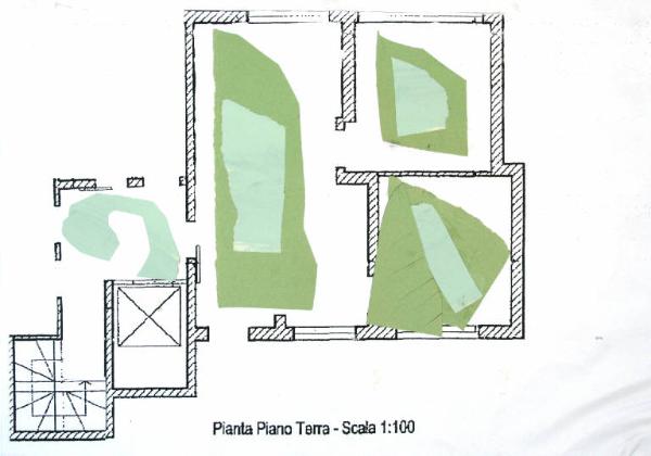 disegno con collage: cartoncino, carta e pittura acrilica su fotocopia. Colore: verde, grigio-verde, bianco. Soggetto: progetto di pavimento. Scritta sulla parte bianca del foglio, in basso, al centro, in stampatello maiuscolo: "pianta piano terra, scala 1:100".