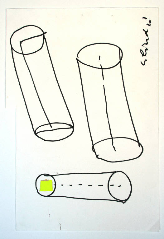 disegno in tecnica mista: pennarello e cartoncino su A4. Colore: nero, bianco e giallo. Soggetto: studio di design per gambe di un tavolo, tre forme cilindriche di diverse dimensioni. Scritta relativa al soggetto in basso a destra, sulla parte bianca del foglio, in corsivo minuscolo, a pennarello nero: "cilindri". Il foglio è tagliato su un lato. Disegno firmato e datato a matita: Susanna, 21/02/02.