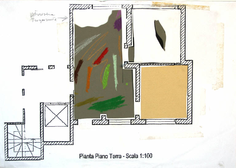 disegno a tecnica mista: collage e pastelli a olio su fotocopia. Colore: bianco, nero, grigio, beige, viola, verde chiaro e scuro, arancio, rosso, marrone, celeste, lilla. Soggetto: progetto di pavimento. Scritte: "vetroresina trasparente", "pianta piano terra - scala 1:100". Disegno firmato e datato sul verso: Angela, 26/03/02.