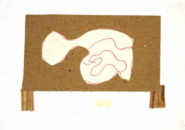 disegno a collage di carte e pennarello. Colore: bianco, rosso, marrone chiaro. Soggetto: progetto di oggetto di design - tavolo.