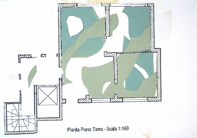 collage di cartoncino, tenuto da scotch di carta, su fotocopia. Colore: grigio medio, grigio-azzurro, bianco e nero. Soggetto: progetto di decorazione di pavimento. Scritta: "pianta piano terra - scala 1:100". Disegno firmato e datato: Savino, 26/03/02.
