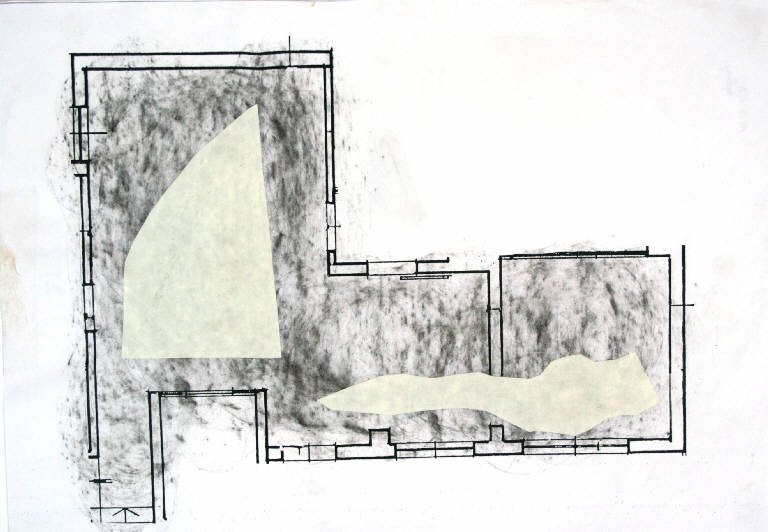 disegno a fusaggine e collage su fotocopia. Colore: bianco, nero, grigio e avana. Soggetto: progetto di decorazione di pavimento.