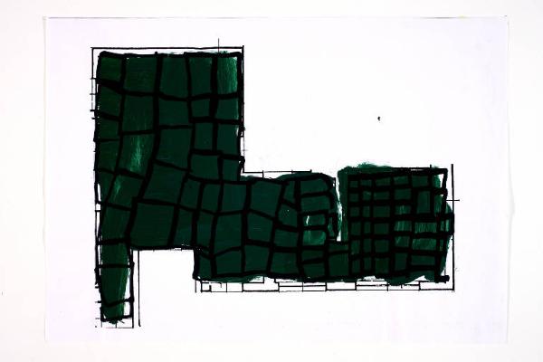 tecnica mista: pennarello e acrilico su fotocopia di carta bianca. Colore: nero, verde scuro. Soggetto: progetto di pavimento. Disegno firmato e datato sul verso: Angela, 18-19/02/02.