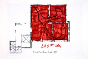 pennarello su fotocopia di carta bianca. Colore: nero, bordeaux. Soggetto: progetto di pavimento. Scritta: "pianta piano terra - scala 1:100". Disegno firmato sul recto con pennarello bordeaux e sul verso con data: "Angela, 5/03/02".