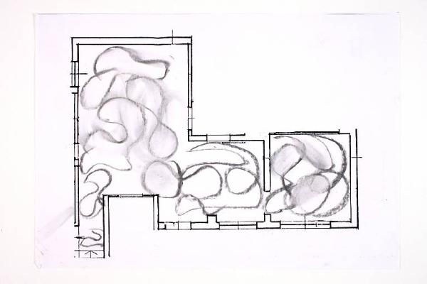 fusaggine su fotocopia di carta bianca. Colore: nero. Soggetto: progetto di pavimento. Disegno firmato e datato sul verso : "Angela, 18/02/02".