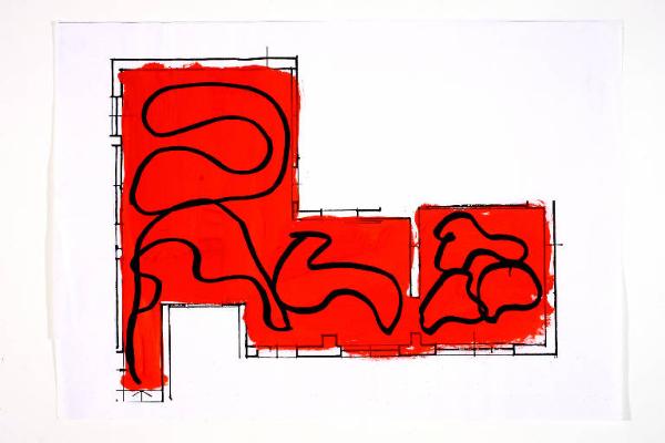 tecnica mista: acrilico e pennarello su fotocopia di carta bianca. Colore: nero, rosso. Soggetto: progetto di pavimento. Disegno firmato e datato sul verso : "Angela, 18-19/02/02".