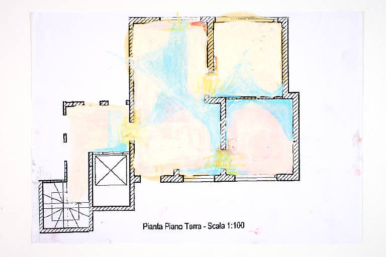 tecnica mista: pastello e pittura a olio su fotocopia di carta bianca. Colore: nero, giallo, rosa scuro e chiaro, azzurro chiaro, bianco titanio. Soggetto: progetto di pavimento. Scritta: "pianta piano terra - scala 1:100".