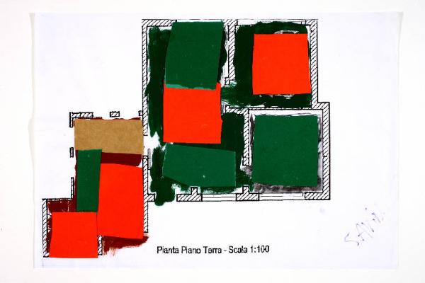 tecnica mista e collage: cartoncino e acrilico su fotocopia di carta bianca. Colore: nero, rosso, verde scuro, verde smeraldo, terra di Siena bruciata scura, beige scuro. Soggetto: progetto di pavimento. Scritta: "pianta piano terra - scala 1:100". Disegno firmato e datato sul recto, con pennarello viola: Savino.
