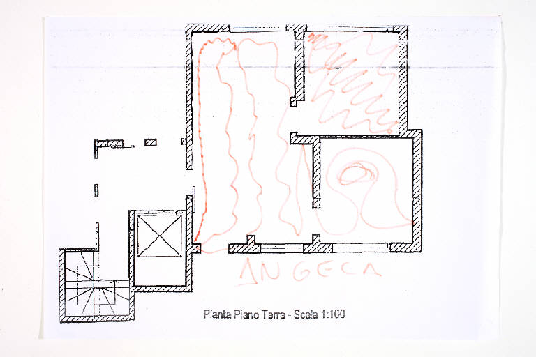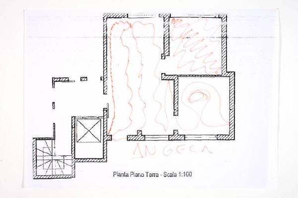 pennarello su fotocopia di carta bianca. Colore: nero, rosso. Soggetto: progetto di pavimento. Scritta: "pianta piano terra - scala 1:100". Disegno firmato sul recto con pennarello rosso: "Angela".