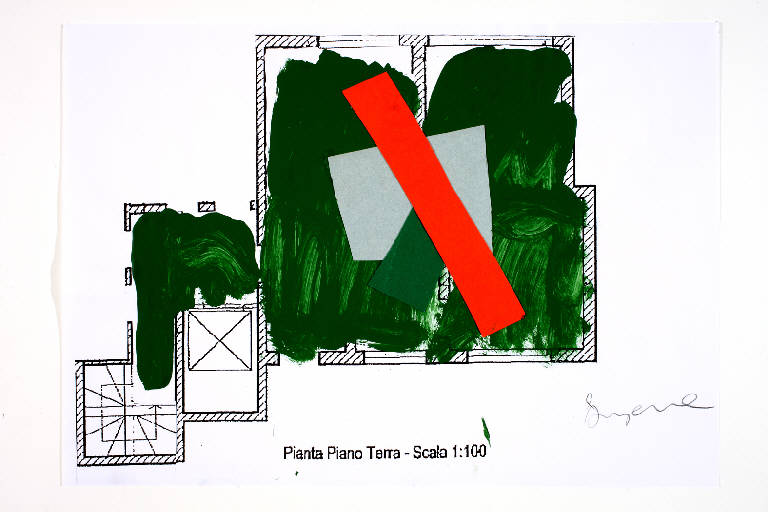 tecnica mista e collage: acrilico e cartoncino colorato su fotocopia di carta bianca. Colore: nero, verde scuro, verde smeraldo, rosso, grigio. Soggetto: progetto di pavimento. Scritta: "pianta piano terra - scala 1:100". Disegno firmato sul recto a matita: "Susanna".