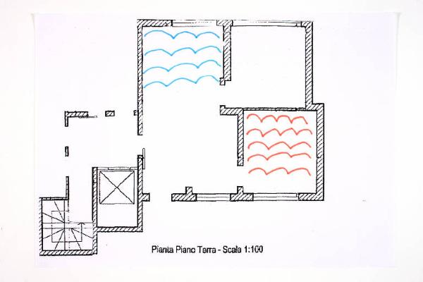 pennarello su fotocopia di carta bianca. Colore: nero, celeste, rosso. Soggetto: progetto di pavimento. Scritta: "pianta piano terra - scala 1:100".