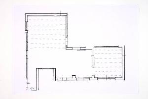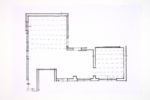 pennarello su fotocopia di carta bianca. Colore: nero, grigio. Soggetto: progetto di pavimento. Scritta: "pianta piano terra - scala 1:100".