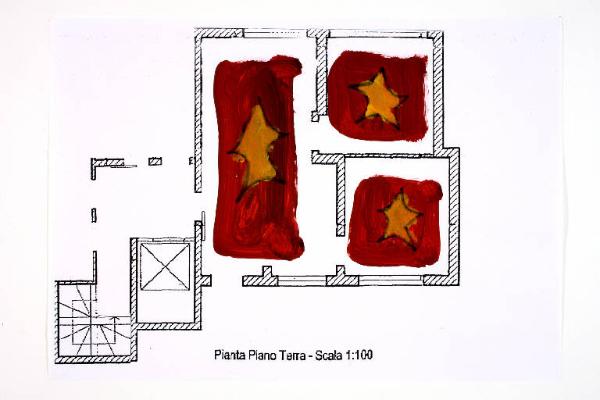 tecnica mista: acrilico e pennarello su fotocopia di carta bianca. Colore: nero, marrone, ocra scuro. Soggetto: progetto di pavimento. Scritta: "pianta piano terra - scala 1:100".