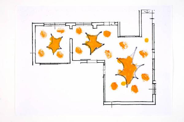 tecnica mista: acrilico e pennarello su fotocopia di carta bianca. Colore: nero, arancio. Soggetto: progetto di pavimento.