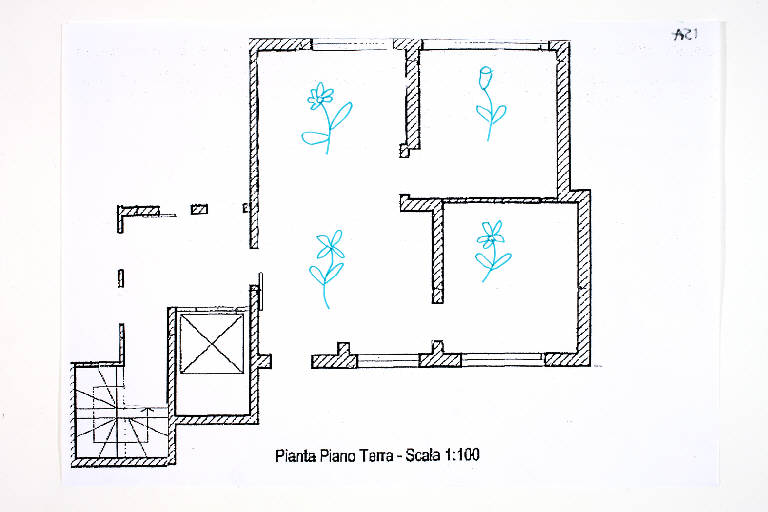 pennarello su fotocopia di carta bianca. Colore: nero, verde. Soggetto: progetto di pavimento. Scritta: "pianta piano terra - scala 1:100". Disegno firmato sul verso con pennarello nero: "Isa".