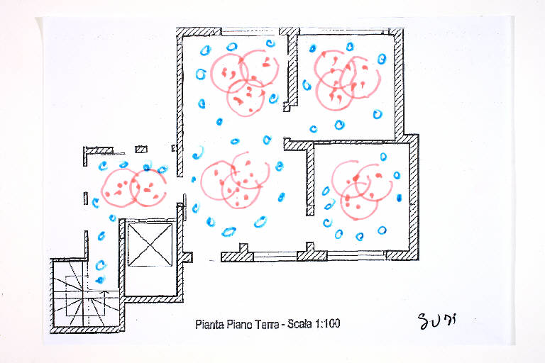 pennarello su fotocopia di carta bianca. Colore: nero, azzurro, rosa. Soggetto: progetto di pavimento. Scritta: "pianta piano terra - scala 1:100". Disegno firmato sul recto con pennarello nero: "Susi".