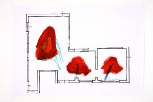 tecnica mista: acrilico e pennarello su fotocopia di carta bianca. Colore: nero, rosso, azzurro. Soggetto: progetto di pavimento.