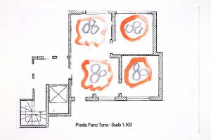 tecnica mista: fusaggine e acrilico su fotocopia di carta bianca. Colore: nero, rosso-arancio, grigio. Soggetto: progetto di pavimento. Scritta: "pianta piano terra - scala 1:100".