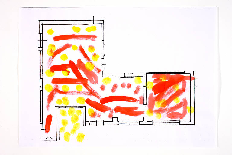 acrilico acquerellato su fotocopia di carta bianca. Colore: nero, rosso, giallo. Soggetto: progetto di pavimento. Disegno firmato e datato sul verso: "Savino, 18.02.02".
