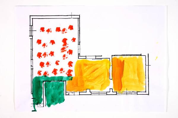 acrilico acquerellato su fotocopia di carta bianca. Colore: nero, rosso, ocra scura, verde. Soggetto: progetto di pavimento. Disegno firmato e datato sul verso: "Savino, 18.02.02".