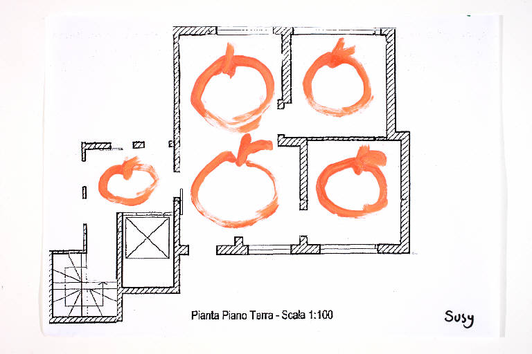 acrilico su fotocopia di carta bianca. Colore: nero, rosso-arancio. Soggetto: progetto di pavimento. Scritta: "pianta piano terra - scala 1:100". Disegno firmato sul recto con pennarello nero: "Susy".