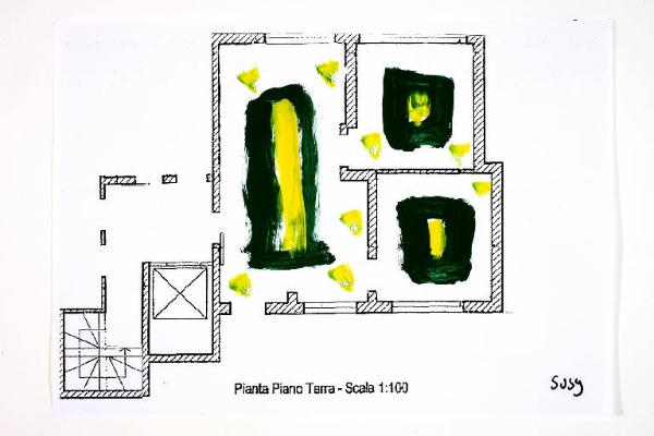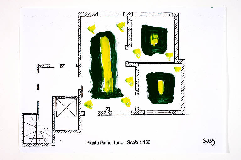 acrilico su fotocopia di carta bianca. Colore: nero, giallo, verde scuro. Soggetto: progetto di pavimento. Scritta: "pianta piano terra - scala 1:100". Disegno firmato sul recto con pennarello nero: "Susy".