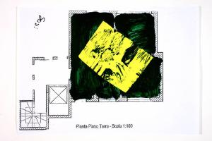 tecnica mista e collage: acrilico e cartoncino su fotocopia di carta bianca. Colore: nero, giallo scuro, verde scuro. Soggetto: progetto di pavimento. Scritta: "pianta piano terra - scala 1:100". Disegno firmato sul recto con pennarello nero: "Susi".