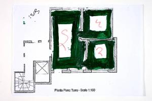 tecnica mista: acrilico e pennarello su fotocopia di carta bianca. Colore: nero, verde scuro, rosa. Soggetto: progetto di pavimento. Scritta: "pianta piano terra - scala 1:100". Disegno firmato sul recto con pennarello nero: "Susi".