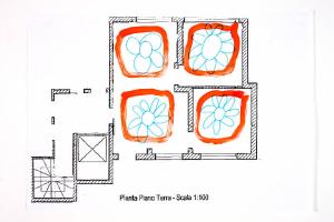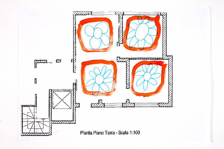 tecnica mista: acrilico e pennarello su fotocopia di carta bianca. Colore: nero, verde smeraldo, rosso-arancio. Soggetto: progetto di pavimento. Scritta: "pianta piano terra - scala 1:100".