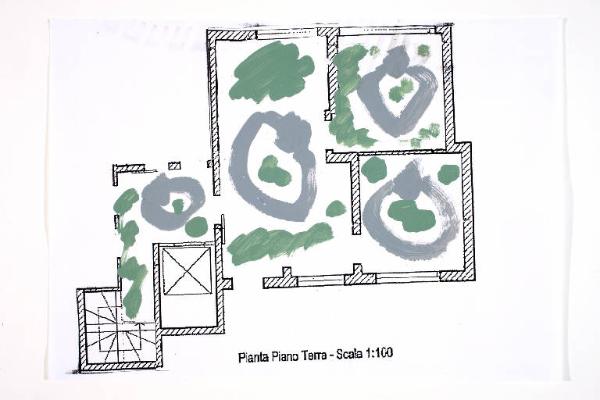 acrilico su fotocopia di carta bianca. Colore: verde oliva, grigio, nero. Soggetto: progetto di pavimento. Scritta: "pianta piano terra - scala 1:100".