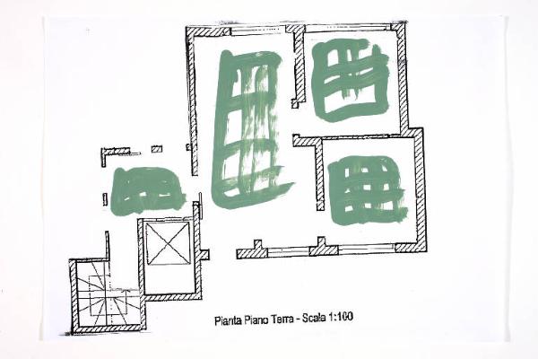 acrilico su fotocopia di carta bianca. Colore: verde oliva, nero. Soggetto: progetto di pavimento. Scritta: "pianta piano terra - scala 1:100".