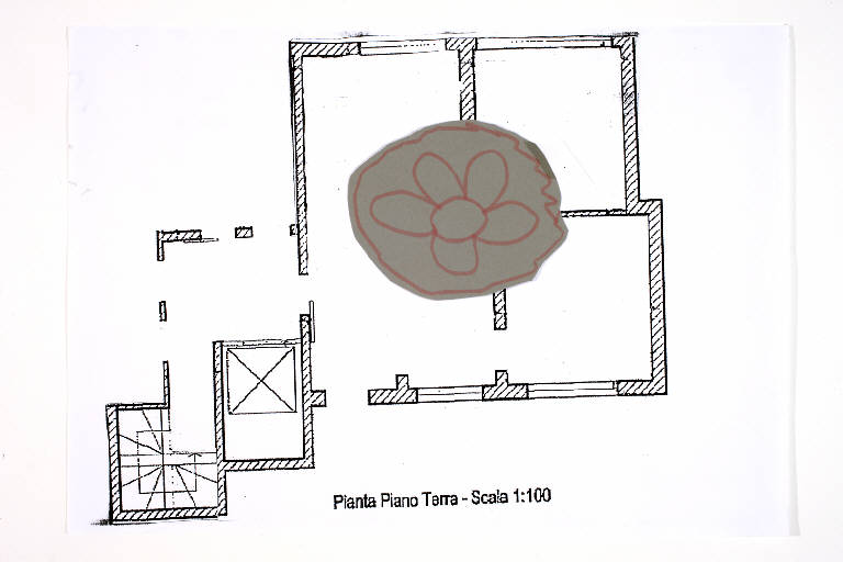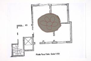 tecnica mista: scotch, cartoncino colorato, pennarello, su fotocopia di carta bianca. Colore: nero, grigio, rosa. Soggetto: progetto di pavimento. Scritta: "pianta piano terra - scala 1:100". Disegno firmato e datato sul verso: "Isa, 14.03.02".