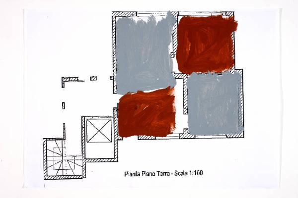 acrilico su fotocopia di carta bianca. Colore: nero, grigio, marrone. Soggetto: progetto di pavimento. Scritta: "pianta piano terra - scala 1:100".