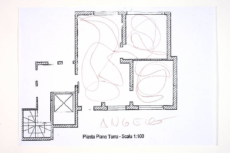 matita sanguigna scura su fotocopia di carta bianca. Colore: marrone, nero. Soggetto: progetto di pavimento. Scritta: "pianta piano terra - scala 1:100". Disegno firmato sul recto con matita sanguigna: "Angela".