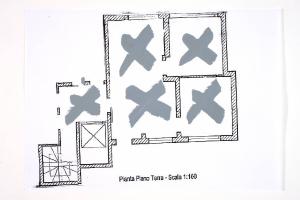 acrilico su fotocopia di carta bianca. Colore: nero, grigio. Soggetto: progetto di pavimento. Scritta: "pianta piano terra - scala 1:100".