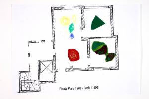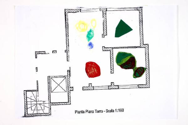 tecnica mista e collage: cartoncino, carta, pastelli a olio su fotocopia di carta bianca. Colore: nero, bianco, giallo, verde scuro, rosso, blu. Soggetto: progetto di pavimento. Scritta: "pianta piano terra - scala 1:100". Disegno firmato e datato sul verso: "Angela 19/03/02".