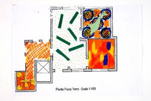 tecnica mista e collage: cartoncino e pennarello su fotocopia di carta bianca. Colore: nero, verde chiaro, verde scuro, arancio, giallo, rosso, blu. Soggetto: progetto di pavimento. Scritta: "pianta piano terra - scala 1:100". Disegno firmato e datato sul verso: "Susanna, 26.03.02".