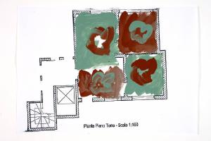 acrilico su fotocopia di carta bianca. Colore: nero, verde oliva, marrone. Soggetto: progetto di pavimento. Scritta: "pianta piano terra - scala 1:100".