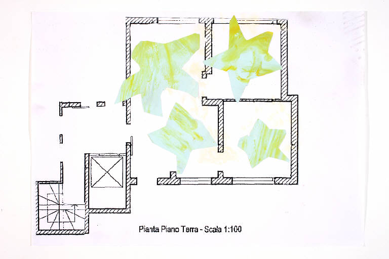 tecnica mista e collage: cartoncino, acrilico su fotocopia di carta bianca. Colore: nero, verde bianco, giallo. Soggetto: progetto di pavimento. Scritta: "pianta piano terra - scala 1:100".