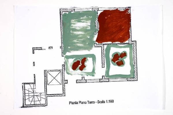acrilico su fotocopia di carta bianca. Colore: nero, verde oliva, terra di Siena scura. Soggetto: progetto di pavimento. Scritta: "pianta piano terra - scala 1:100".