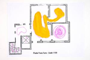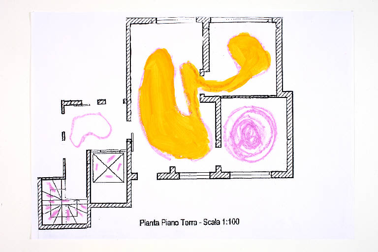 tecnica mista: pastello a cera, acrilico su fotocopia di carta bianca. Colore: nero, viola chiaro, giallo ocra. Soggetto: progetto di pavimento. Scritta: "pianta piano terra - scala 1:100".