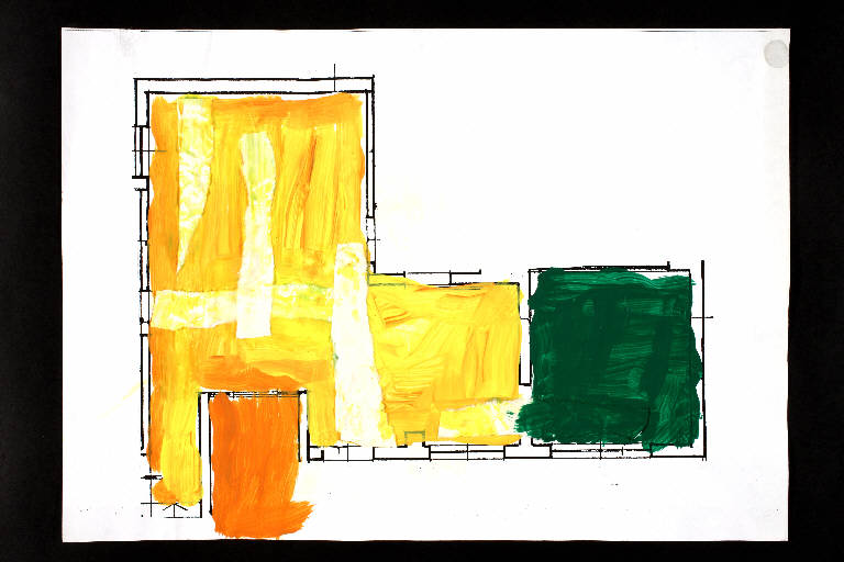 tecnica mista e collage: carta, acrilico, colla vinilica su fotocopia di carta bianca. Colore: nero, bianco, giallo, verde scuro, arancio chiaro e scuro. Soggetto: progetto di pavimento. Scritta: "pianta piano terra - scala 1:100". Disegno firmato e datato sul verso: "Savino, 18/02/02".