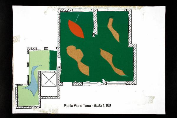 collage: cartoncino colorato, scotch di carta su fotocopia di carta bianca. Il cartoncino colorato è stato ritagliato e sovrapposto a strati, bloccato con lo scotch dal retro. Colore: nero, verde scuro, marrone chiaro, terra di Siena bruciata, verde oliva chiaro, celeste scuro. Soggetto: progetto di pavimento. Scritta: "pianta piano terra - scala 1:100". Disegno firmato e datato sul verso: "Angela, 26/03/02".