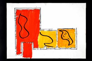 tecnica mista: pennarello, acrilico su fotocopia di carta bianca. Colore: nero, rosso, arancio chiaro e scuro. Soggetto: progetto di pavimento. Scritta: "pianta piano terra - scala 1:100".