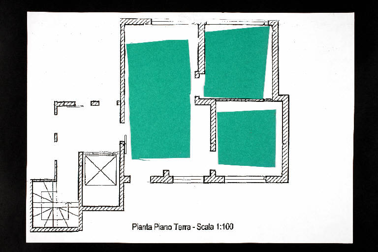 collage: cartoncino colorato su fotocopia di carta bianca. Colore: nero, verde smeraldo. Soggetto: progetto di pavimento.