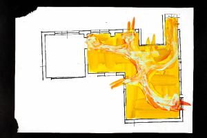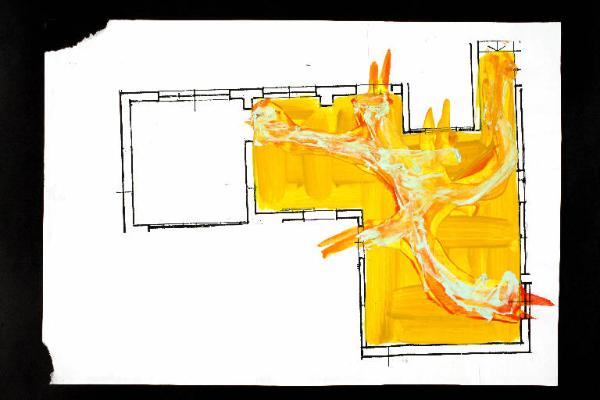 acrilico su fotocopia di carta bianca. Colore: nero, arancio, giallo, rosso, verde bianco. Soggetto: progetto di pavimento.