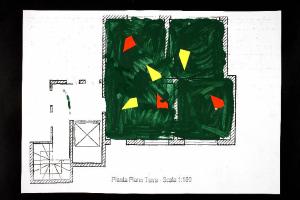 tecnica mista e collage: cartoncino colorato, acrilico, colla vinilica su fotocopia di carta bianca. Colore: nero, giallo fosforescente, rosso fosforescente, verde scuro. Soggetto: progetto di pavimento. Scritta: "pianta piano terra - scala 1:100".